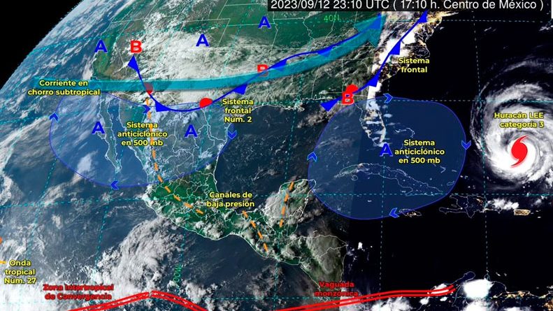 Durante la noche y madrugada de este miércoles 13 de septiembre, canales de baja presión ocasionarán lluvias puntuales muy fuertes en Chiapas y Tabasco, lluvias fuertes en Guerrero, Oaxaca, Veracruz, Yucatán y Campeche, así como intervalos de chubascos en Colima, Jalisco, Michoacán, Estado de México, Morelos y Quintana Roo.
