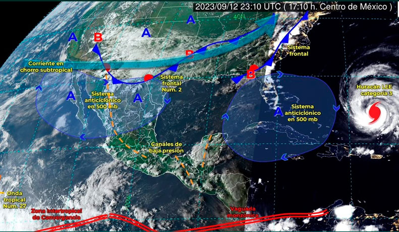 Durante la noche y madrugada de este miércoles 13 de septiembre, canales de baja presión ocasionarán lluvias puntuales muy fuertes en Chiapas y Tabasco, lluvias fuertes en Guerrero, Oaxaca, Veracruz, Yucatán y Campeche, así como intervalos de chubascos en Colima, Jalisco, Michoacán, Estado de México, Morelos y Quintana Roo.