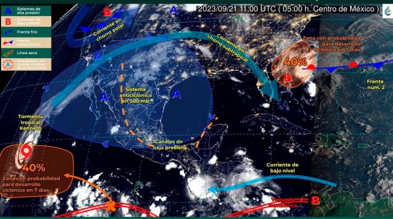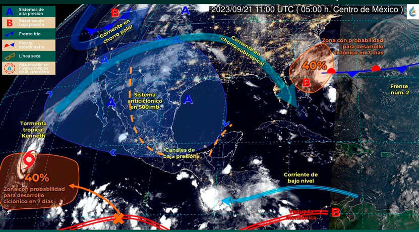 Hoy jueves 21 de septiembre, canales de baja presión, uno extendido sobre el norte, occidente y centro del país y otro en la Península de Yucatán, aunados al ingreso de humedad del Océano Pacífico, Golfo de México y Mar Caribe, originarán lluvias puntuales fuertes sobre Colima, Nayarit, Jalisco, Oaxaca y Chiapas.