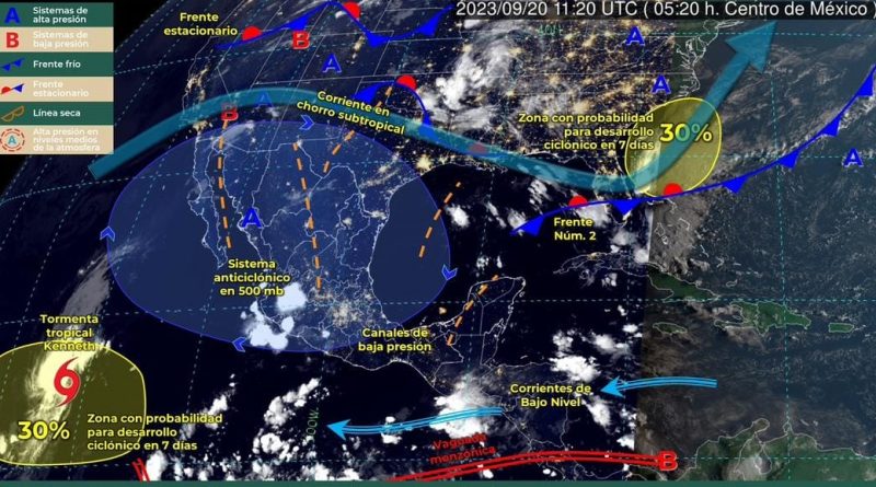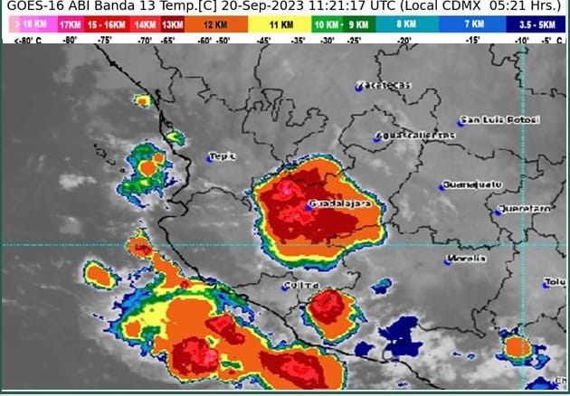 Hoy miércoles 20 de septiembre, canales de baja presión en el interior del territorio mexicano, aunado al ingreso de humedad del Océano Pacífico, Golfo de México y Mar Caribe, producirán chubascos y lluvias puntuales fuertes acompañadas de descargas eléctricas, sobre entidades del centro, sur, sureste y occidente de la República Mexicana, incluido el estado de Colima.