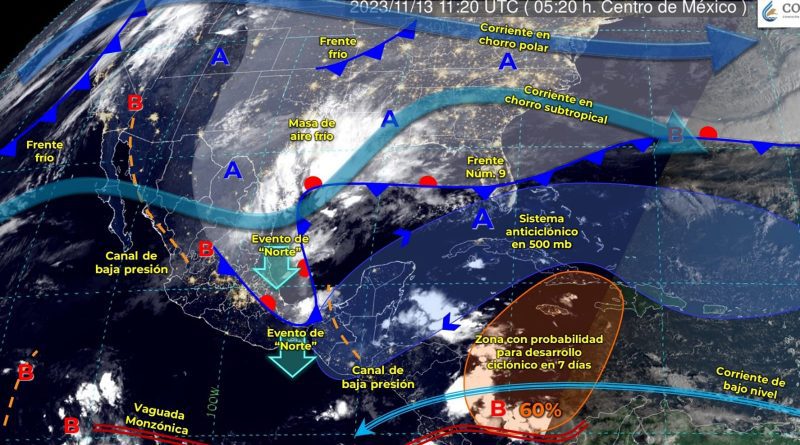 Así mismo, prevé que un canal de baja presión sobre el occidente, centro y sur de la República Mexicana, aunado al ingreso de humedad proveniente del Océano Pacífico y del Mar Caribe, propiciarán lluvias e intervalos de chubascos con descargas eléctricas en las regiones mencionadas.