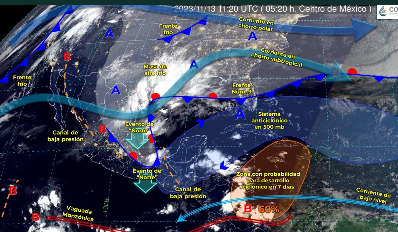 Así mismo, prevé que un canal de baja presión sobre el occidente, centro y sur de la República Mexicana, aunado al ingreso de humedad proveniente del Océano Pacífico y del Mar Caribe, propiciarán lluvias e intervalos de chubascos con descargas eléctricas en las regiones mencionadas.
