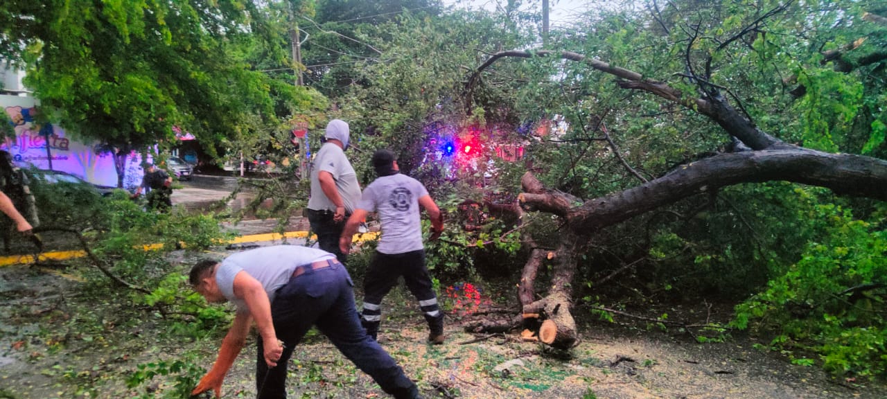 Asimismo se atendió el reporte de otro árbol caído sobre la calle Cóndor, esquina con la avenida Pablo Silva, en la colonia los Triángulos, el cual cayó sobre dos vehículos, generando daños materiales.