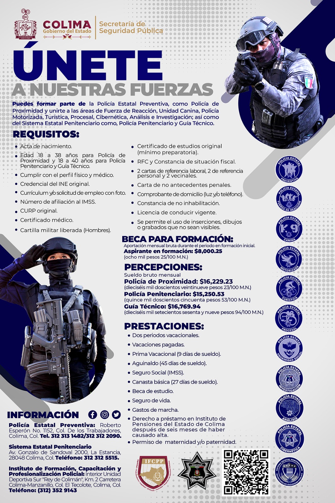 La dependencia estatal convoca a mujeres y hombres de 18 a 40 años, con vocación de servicio, que quieran unirse a la corporación dentro de sus áreas de Policía Estatal Preventiva, Policía Penitenciario, y/o Guía Técnico, donde servirán con honor, disciplina y compromiso para proteger a la ciudadanía colimense.