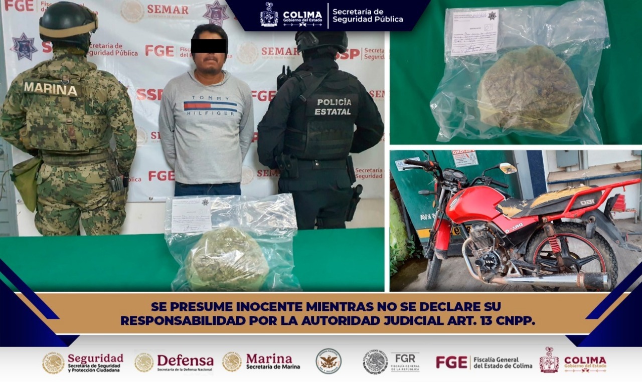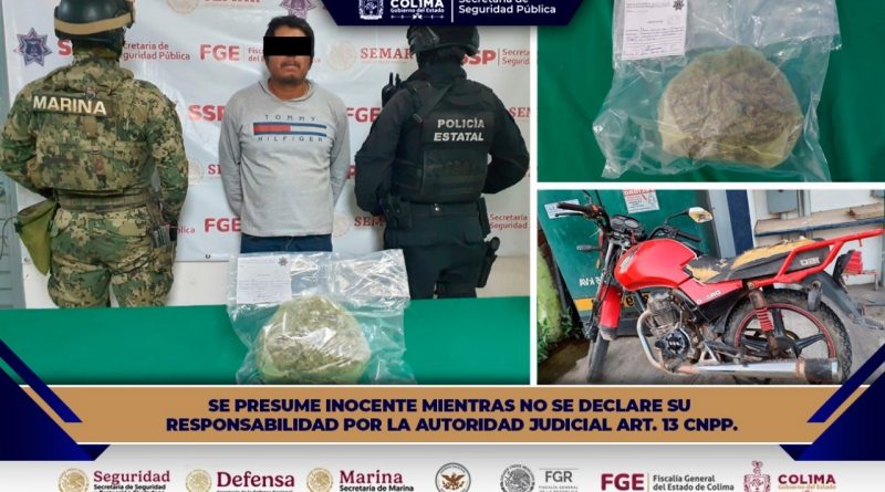 La Secretaría de Seguridad Pública del Gobierno del Estado de Colima informa que agentes de la Policía Estatal Preventiva (PEP), en coordinación con personal operativo de la Secretaría de Marina Armada de México (Semar), realizaron la detención de un masculino en el municipio de Tecomán, por su probable participación en el delito contra la salud.