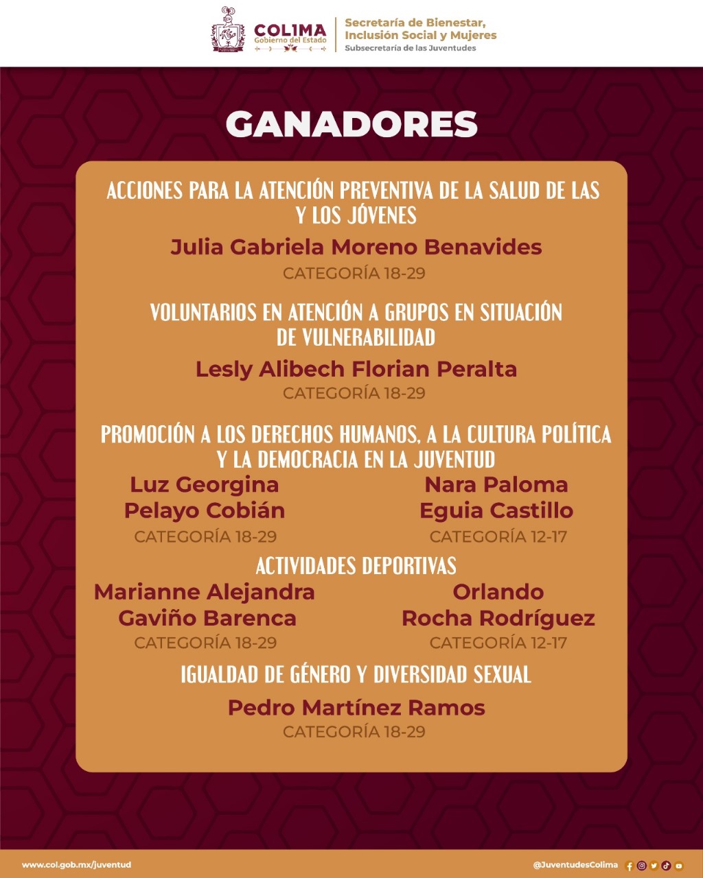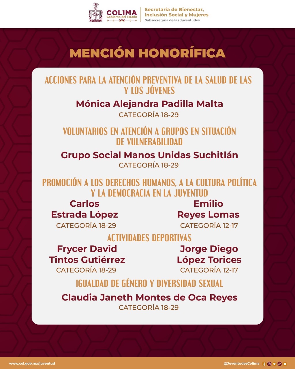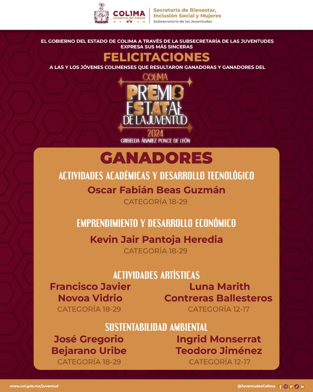 La Subsecretaría de las Juventudes del Gobierno del Estado de Colima reveló las y los ganadores del Premio Estatal de la Juventud 2024 ‘Griselda Álvarez Ponce de León’. El titular de la Subsejuv, Gerardo Romero Quezada, informó que se recibieron más de cien expedientes y tras el trabajo del Jurado Calificador, se dictaminó que siete mujeres y seis hombres son acreedores al premio, y que cuatro mujeres, siete hombres y el grupo social ‘Manos Unidas’ obtienen menciones honoríficas.