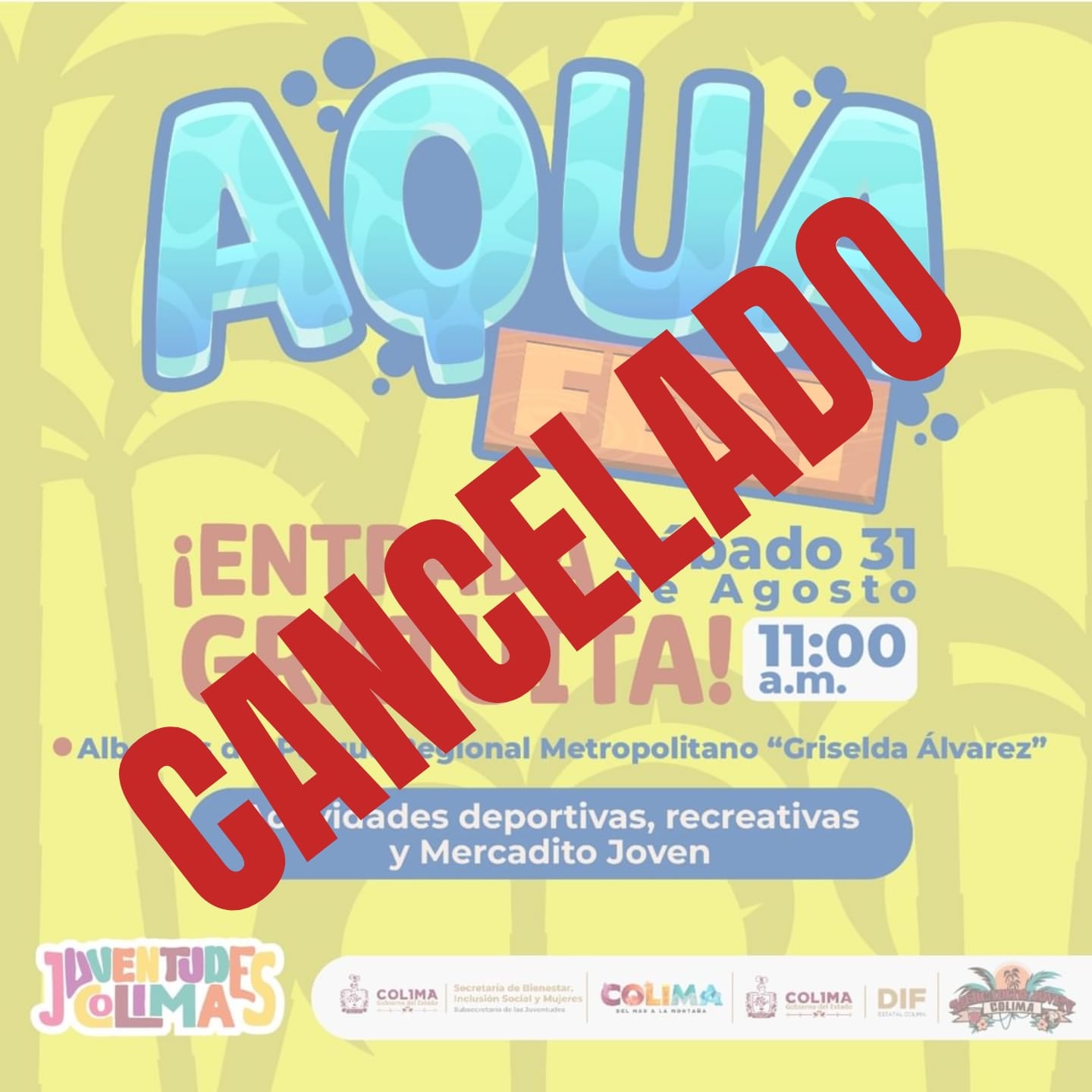 Por recomendación de Unidad Estatal de Protección Civil (UEPC) del Gobierno del Estado de Colima, se suspende el ‘Aqua Fest 2024’ que realizaría hoy sábado la Subsecretaría de las Juventudes (Subsejuv), con el objetivo de no poner en riesgo a las y los asistentes, por las condiciones climatológicas que prevalecen.