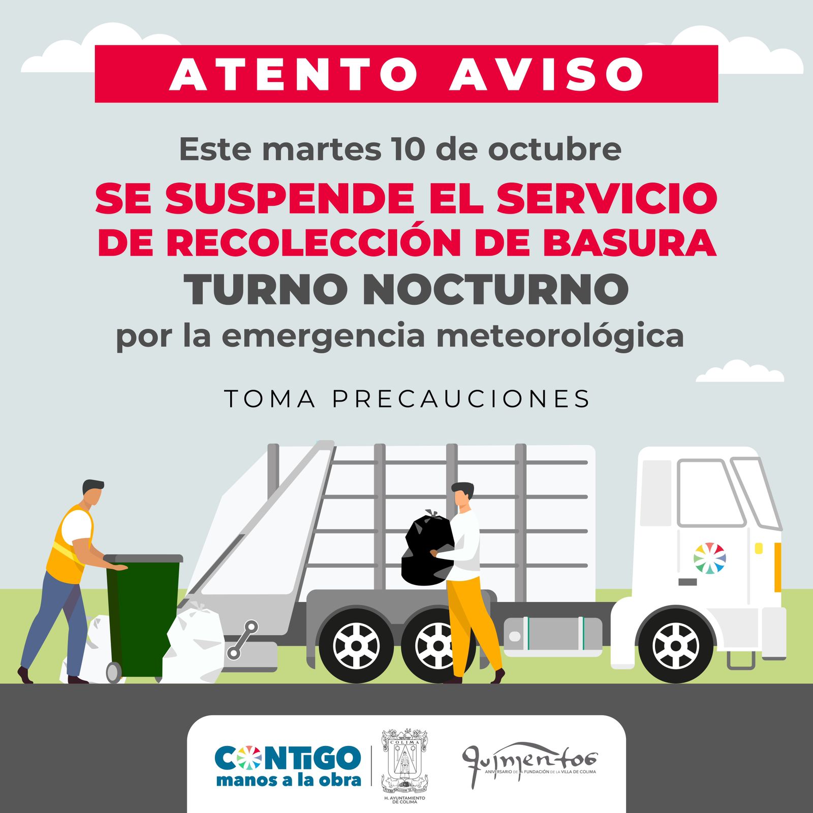 El Ayuntamiento de Colima, a través de la Dirección General de Servicios Públicos, informa a la ciudadana que este martes 10 de octubre se suspende el servicio de recolección de basura en su ruta nocturna, debido a la situación climática adversa.