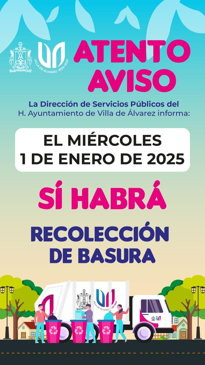 Villa de Álvarez, Col.- El Ayuntamiento de Villa de Álvarez, a través de la Dirección de Servicios Públicos, informa a la población que también los días martes 31 de diciembre y miércoles primero de enero de 2025, el servicio de recolección de basura en las colonias y comunidades del municipio se prestará de manera normal.