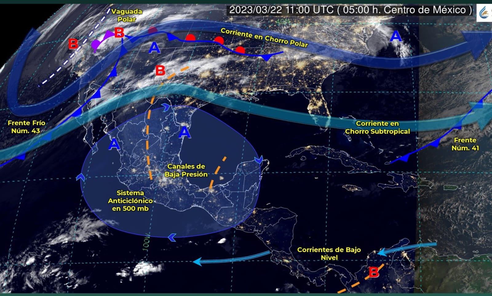 En el pronóstico por regiones, para el Pacífico Centro se contempla cielo parcialmente nublado y sin lluvia en la región. Ambiente fresco durante la mañana y caluroso a muy caluroso por la tarde. Viento de componente oeste de 10 a 25 kilómetros por hora en la región, con rachas de hasta 50 km/h en la región.