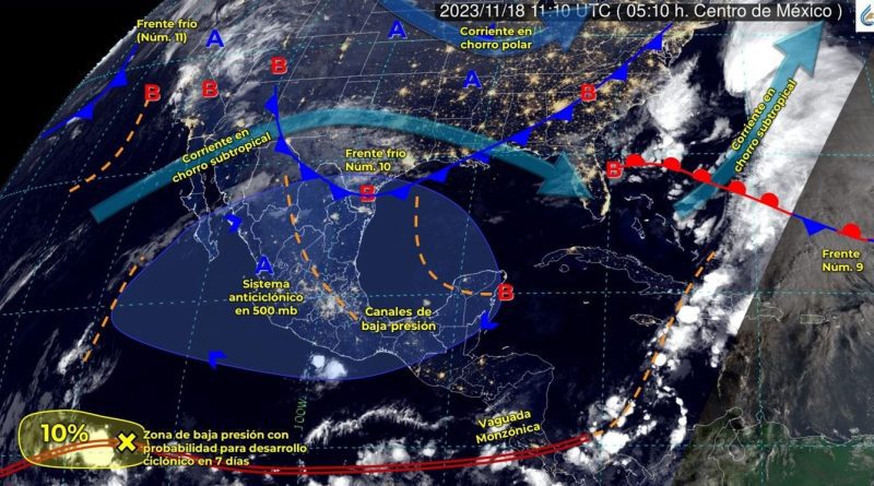 Hoy sábado 18 de noviembre, el sistema anticiclónico en niveles medios y altos de la atmósfera mantendrá el cielo despejado con baja probabilidad de lluvia y ambiente cálido a caluroso en la mayor parte del país, con temperaturas máximas de 35 a 40 grados Celsius en Colima, Jalisco, Michoacán, Guerrero, Sonora, Sinaloa, Nayarit, Oaxaca y Chiapas, informa el Servicio Meteorológico Nacional (SMN).