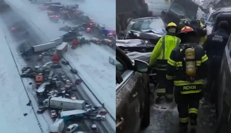 Una intensa tormenta de nieve que avanza por el centro-norte de Estados Unidos y la región de los Grandes Lagos provocó condiciones peligrosas para los viajeros del fin de semana de Acción de Gracias. La combinación de nieve intensa, visibilidad reducida y carreteras resbaladizas contribuyó a un choque masivo que involucró al menos 45 vehículos en la Interestatal 70, cerca de Terre Haute, Indiana, obligando a cerrar la vía en dirección oeste alrededor del mediodía, según informó la Policía Estatal.