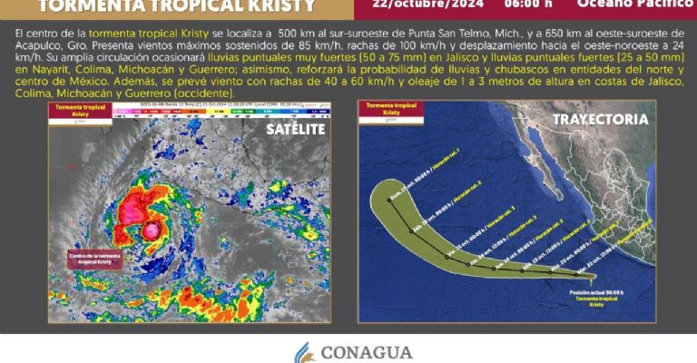 El servicio Meteorológico Nacional (SMN) informó que el centro de la Tormenta Tropical Kristy se localiza a 480 kilómetros al sur-suroeste de Punta San Telmo, Michoacán y a 605 kilómetros al oeste-suroeste de Acapulco, Guerrero. Presenta vientos máximos sostenidos de 85 kilómetros, rachas de 100 kilómetros y desplazamiento hacia el oeste-noroeste a 24 kilómetros por hora.