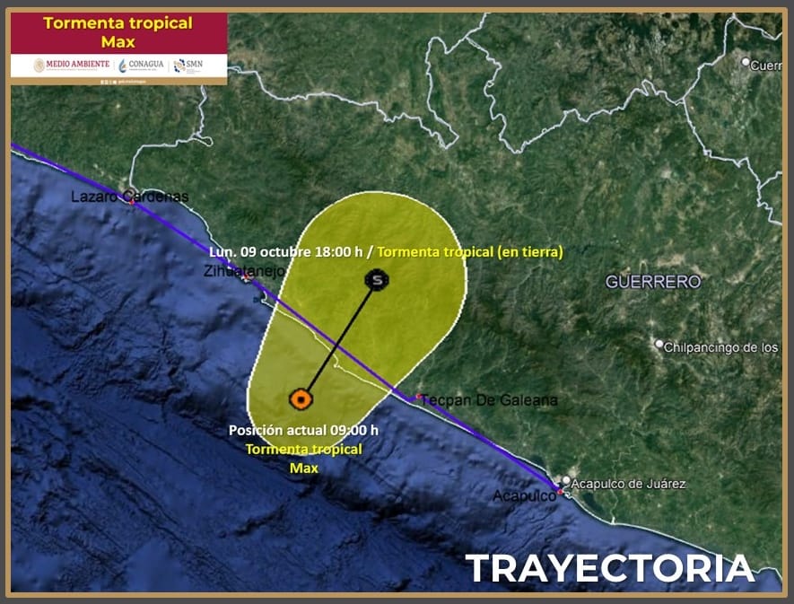 La Unidad Estatal de Protección Civil (UEPC) del Gobierno del Estado de Colima se mantiene en alerta permanente, pues el Servicio Meteorológico Nacional (SMN) en su reporte más reciente a las 9:00 de la mañana, informa que de mantener su trayectoria y velocidad de desplazamiento, se prevé que el centro de la tormenta tropical ‘Max’ ingrese a tierra entre las 12:00 y 14:00 horas en las inmediaciones de Petatlán y Tecpan, Guerrero.