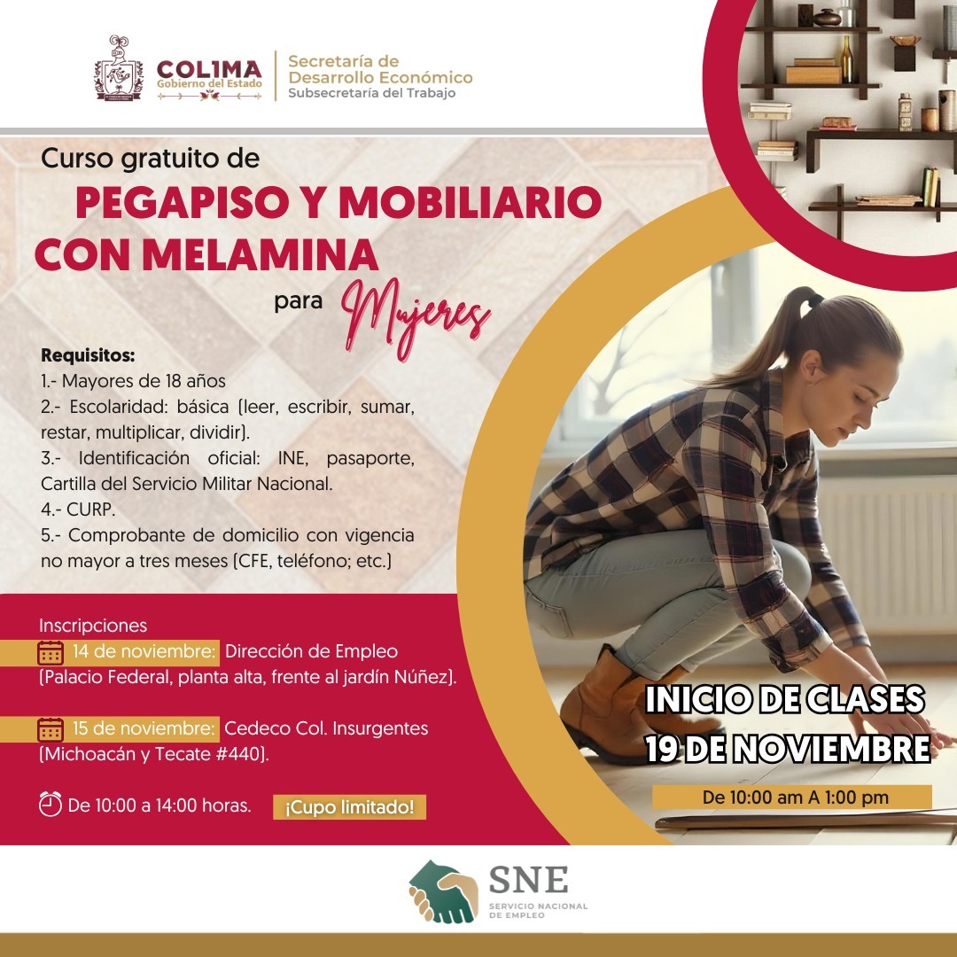 La Subsecretaría del Trabajo del Gobierno del Estado de Colima, en coordinación con el Servicio Nacional de Empleo (SNE), invita a todas las mujeres interesadas en participar en el ‘Curso gratuito de pegapiso y mobiliario con melamina’, dentro del Programa de Apoyo Integral de Capacitación y Autoempleo, para proporcionar nuevas herramientas y habilidades prácticas, promoviendo el autoempleo y estimulando la creatividad en el ámbito de la construcción y la decoración.