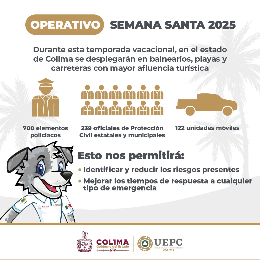 Con el operativo Semana Santa y Pascua 2025, la Unidad Estatal de Protección Civil (UEPC) del Gobierno del Estado de Colima, en coordinación con los tres niveles de gobierno y grupos voluntarios, se está brindando atención en los puntos turísticos con mayor afluencia en la entidad.