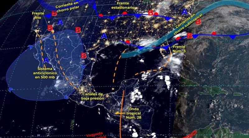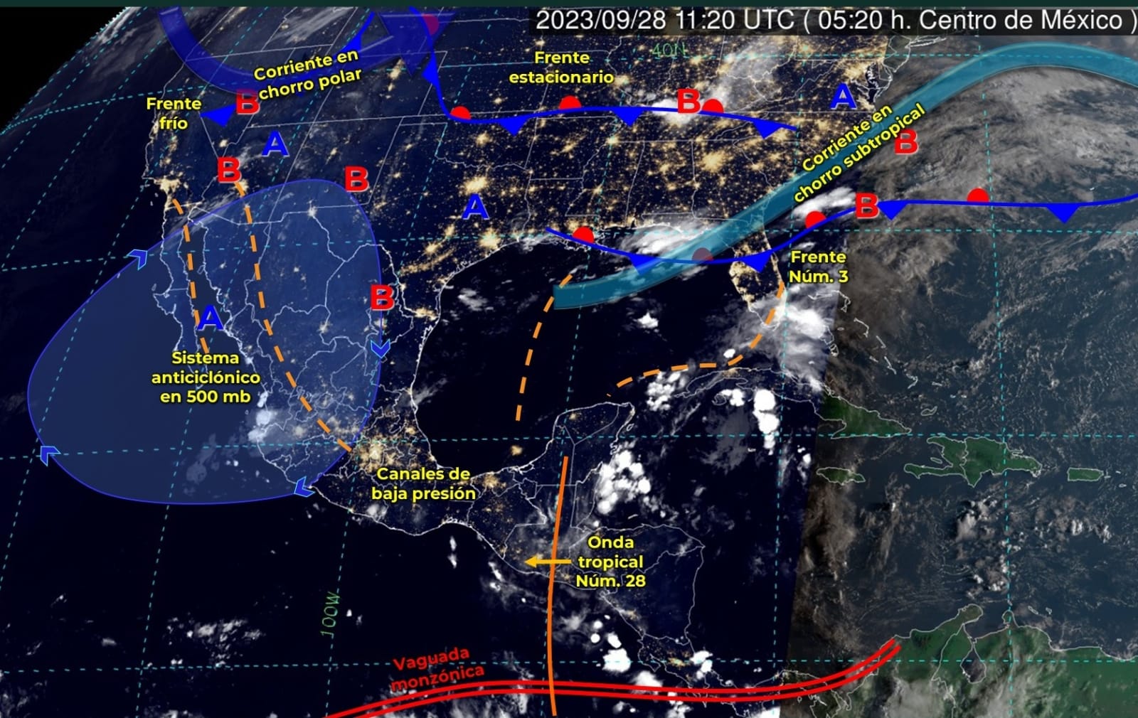 El organismo de la Comisión Nacional del Agua (Conagua), informa que dos canales de baja presión: uno a lo largo del noroeste y occidente de la República Mexicana, y otro sobre el noreste del país, junto la entrada de humedad de ambos océanos, propiciarán intervalos de chubascos con lluvias puntuales fuertes (25 a 50 milímetros) en Colima, Michoacán, Guerrero y Chihuahua, acompañados de descargas eléctricas y posible caída de granizo; originarían visibilidad reducida, encharcamientos, deslaves e inundaciones, así como aumento en los niveles de ríos y arroyos.