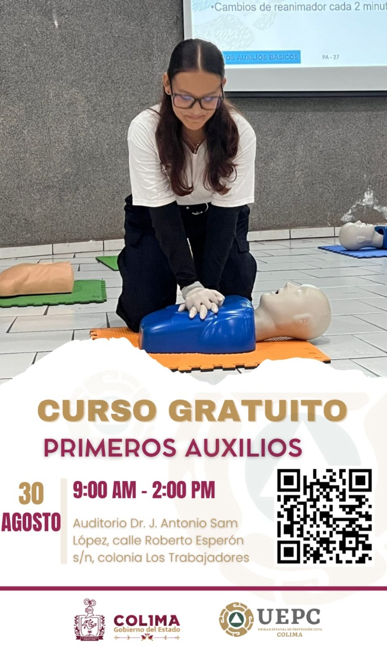 La Unidad Estatal de Protección Civil (UEPC) del Gobierno del Estado de Colima invita a la población de 15 años en adelante a participar en el curso gratuito Primeros Auxilios, a realizarse el próximo sábado 30 de agosto de 9:00 de la mañana 2:00 de la tarde, en el auditorio ‘Dr. Jesús Antonio Sam López’, de la capital del estado.