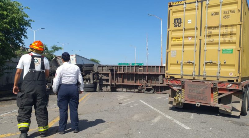 La Unidad Estatal de Protección Civil (UEPC) del Gobierno del Estado de Colima informa que la mañana de este sábado se registró un accidente de tránsito sobre la lateral del libramiento Ejército Mexicano, a la altura del Complejo Administrativo en esta ciudad capital, donde se vieron involucrados tres tractocamiones, uno de los cuales volcó tras el impacto.