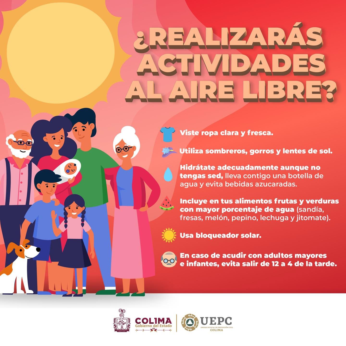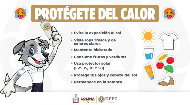 La Unidad Estatal de Protección Civil (UEPC) del Gobierno del Estado de Colima hizo nuevamente un exhorto a toda la población a extremar precauciones y evitar la exposición prolongada a los rayos solares durante las horas de mayor intensidad -de 11:00 de la mañana a 3:00 de la tarde-, pues de acuerdo al reporte del Servicio Meteorológico Nacional (SMN), este domingo las temperaturas en la entidad oscilarán entre 40 y 45 grados centígrados, lo que representa un alto riesgo de sufrir insolación o el llamado ‘golpe de calor’.