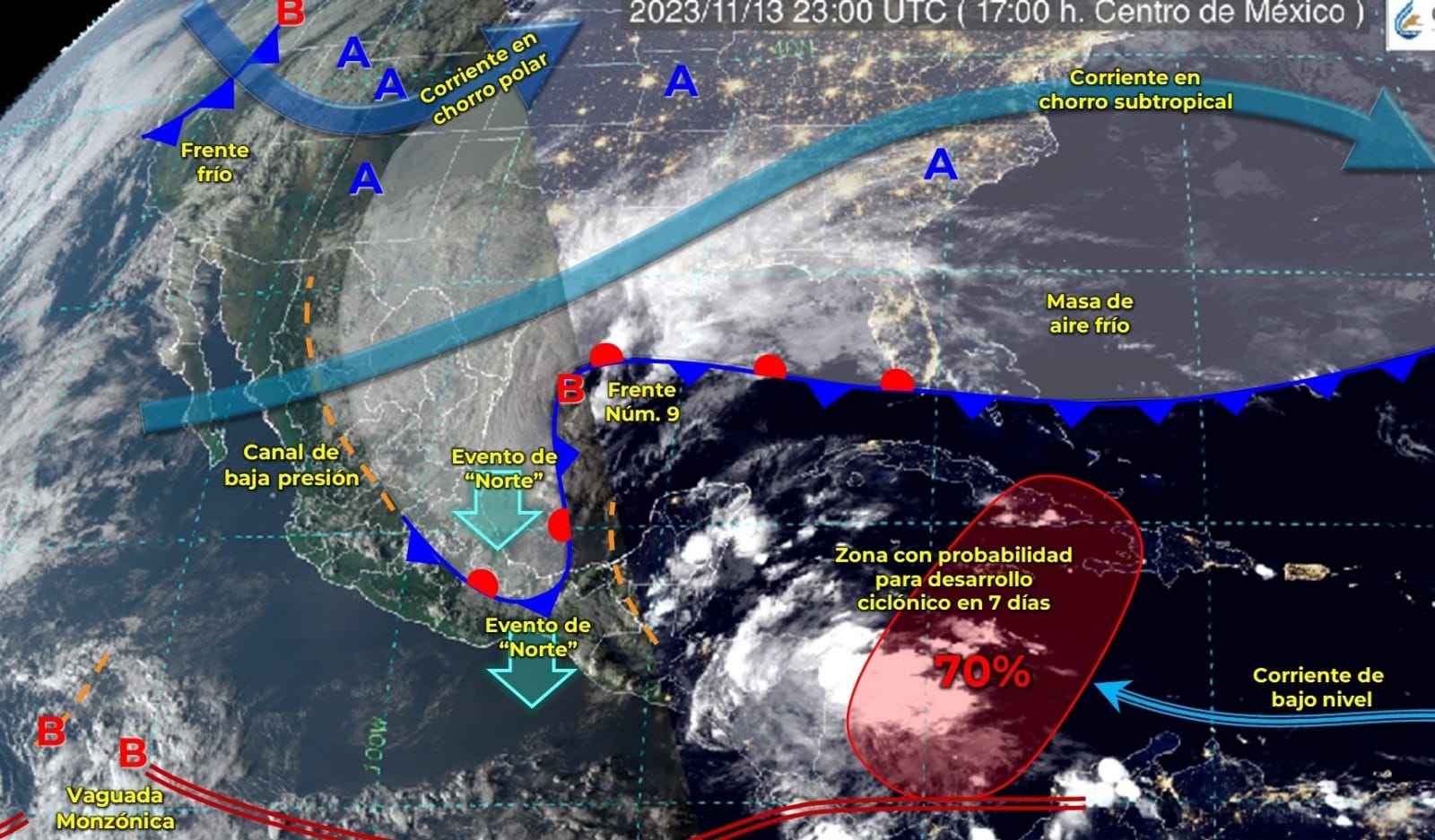 Para el Pacífico Centro se estima cielo medio nublado durante el día, con chubascos y posibles descargas eléctricas en Michoacán y lluvias aisladas en Colima, Jalisco y Nayarit Ambiente fresco por la mañana, frío en sierras de Michoacán y templado sobre costas. Por la tarde, ambiente caluroso en la región.