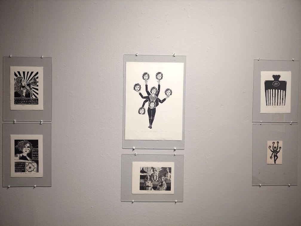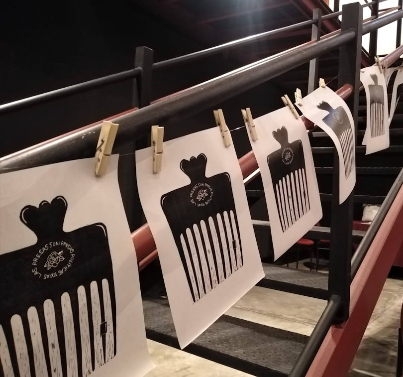 La muestra incluye la instalación “Peineta cárcel”, una pieza de gráfica participativa producto de un taller que coordinó la artista en dos sesiones de diálogo con la participación de aproximadamente 20 personas de distintas edades y formaciones, quienes compartieron experiencias y reflexiones en torno al feminismo y la violencia de género.
