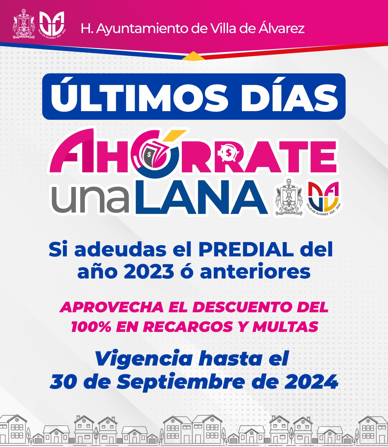 Villa de Álvarez, Col.- El próximo lunes 30 de septiembre será la fecha límite para obtener incentivos fiscales en Villa de Álvarez, por ello el Gobierno Municipal invita a la población a liquidar sus adeudos y evitar el cobro de multas y recargos.