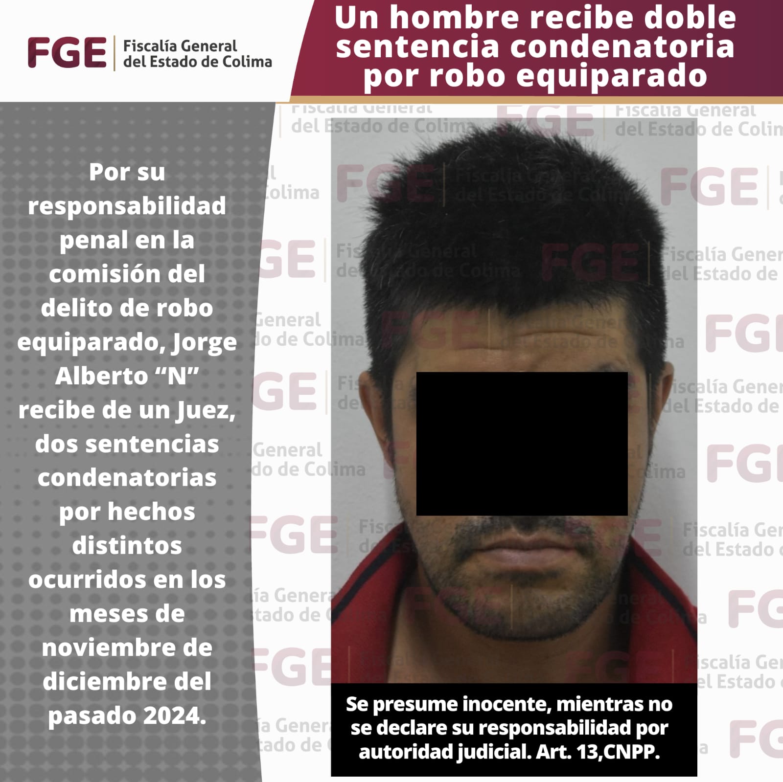 Por su responsabilidad penal en la comisión del delito de robo equiparado, Jorge Alberto “N” recibe de un Juez, dos sentencias condenatorias por hechos distintos ocurridos en los meses de noviembre de diciembre del pasado 2024.