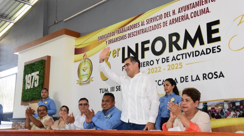 * El alcalde de Colima asistió al Tercer Informe de Actividades del Sindicato de Trabajadores de Armería * Destacó la unidad entre el gobierno y el sindicato para respetar los derechos de los trabajadores.
