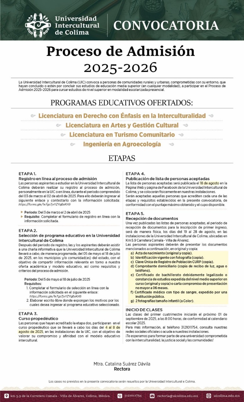 La Universidad Intercultural de Colima (UIC), con sede en el Pueblo Mágico de Comala, dio a conocer su convocatoria para el proceso de admisión 2025-2026, ofertando las licenciaturas de Derecho con énfasis en la Interculturalidad, Turismo Comunitario, Artes y Gestión Cultural, así como la Ingeniería en Agroecología.