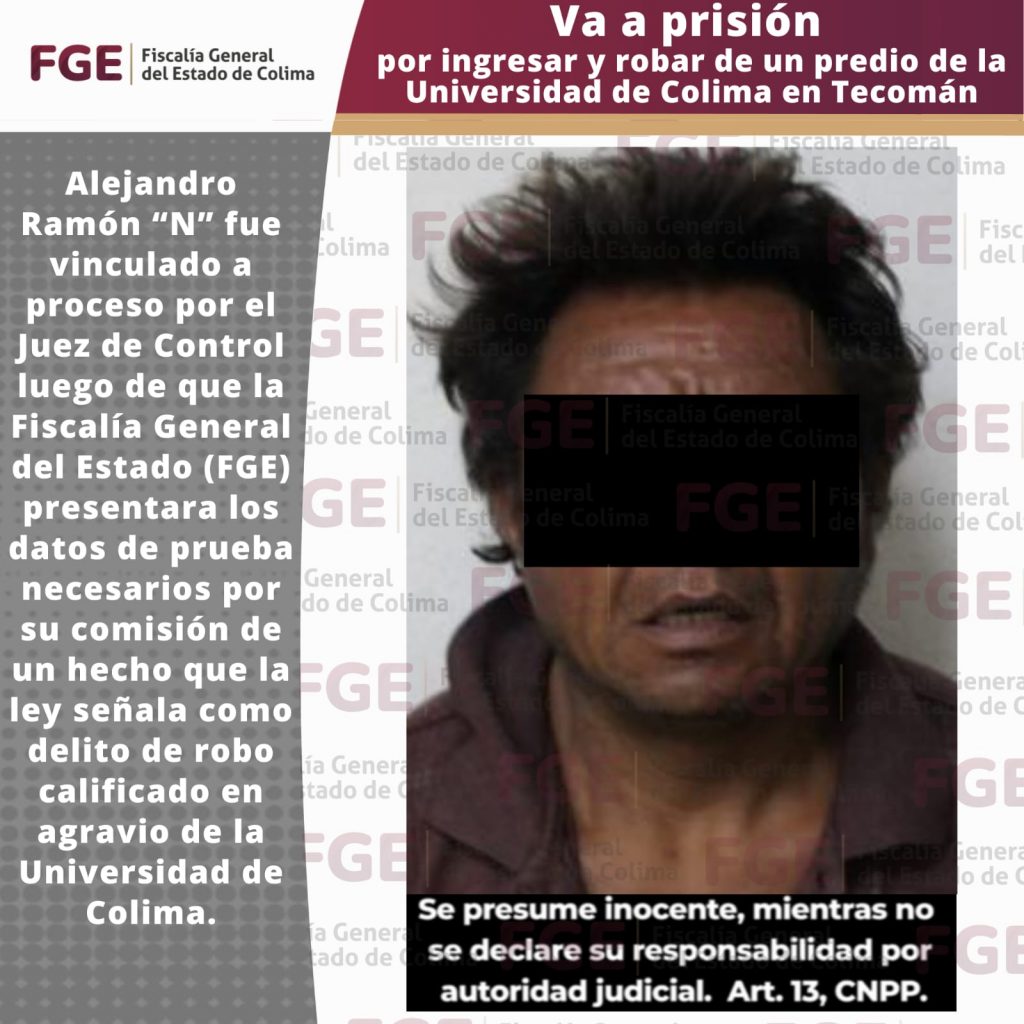 Alejandro Ramón “N” fue vinculado a proceso por el Juez de Control luego de que la Fiscalía General del Estado (FGE) presentara los datos de prueba necesarios por su comisión de un hecho que la ley señala como delito de robo calificado en agravio de la Universidad de Colima.
