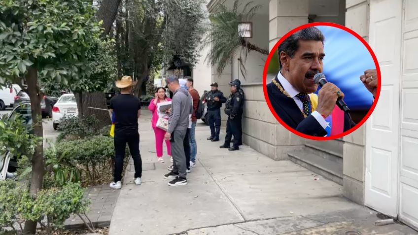 Desde las tres de la tarde integrantes de la comunidad venezolana llegaron a la embajada ubicada en la calle de Schiller en la zona de Polanco, con banderas y gritos se están manifestando de manera pacífica, quien espera, ya que lleguen más integrantes.