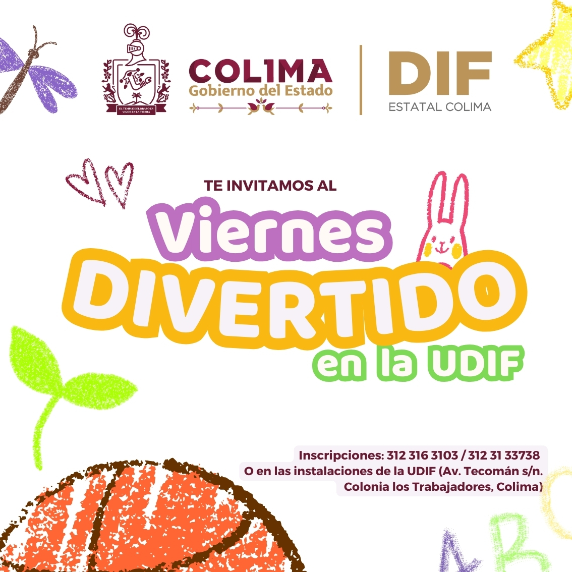 El Sistema para el Desarrollo Integral de la Familia (DIF) del Gobierno del Estado de Colima invita a madres, padres y personas tutoras a registrar a niñas, niños y adolescentes de entre cuatro y catorce años de edad para participar en el programa ‘Viernes Divertido en la UDIF’, que se llevará a cabo el 27 de febrero, de 8:30 de la mañana a 3:00 de la tarde, en la Unidad Deportiva Infantil (UDIF).