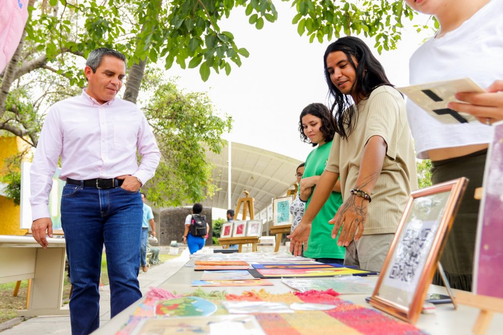 El rector de la Universidad de Colima, Christian Jorge Torres Ortiz Zermeño visitó la expo-venta que organizaron estudiantes de distintos semestres de la Escuela de Artes Visuales de esta casa de estudios, en la que mostraron parte de los trabajos realizados por ellos mismos, desde calcomanías y gráfica hasta fotografía, óleos y estampado de camisetas.