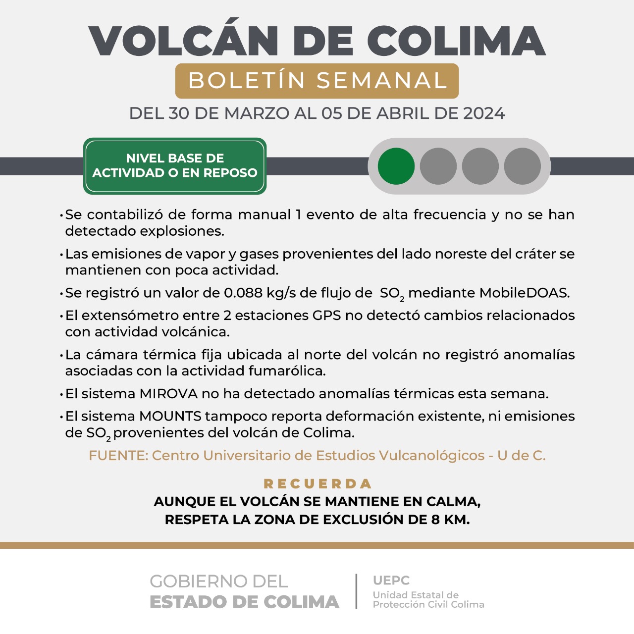 Del sábado 30 de marzo al viernes 5 de abril de 2024, el Centro Universitario de Estudios Vulcanológicos (CUEV) de la Universidad de Colima, contabilizó de forma manual un evento de alta frecuencia; sin embargo no se reportaron explosiones ni se detectaron anomalías asociadas con la actividad fumarólica.