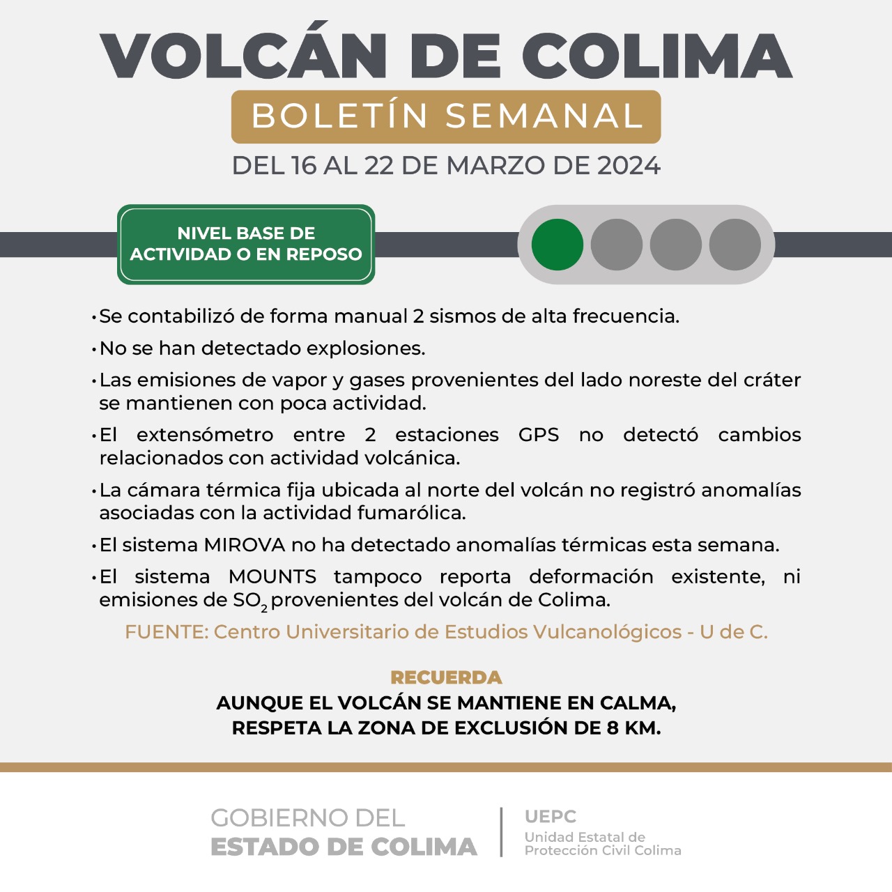 Durante la reunión más reciente del Comité Técnico Científico Asesor del Volcán de Colima, se acordó que a partir de hoy y en lo sucesivo, se emitirá cada viernes el boletín semanal de la actividad volcánica, resaltando el color del semáforo y la zona de exclusión con la información que emite el CUEV.