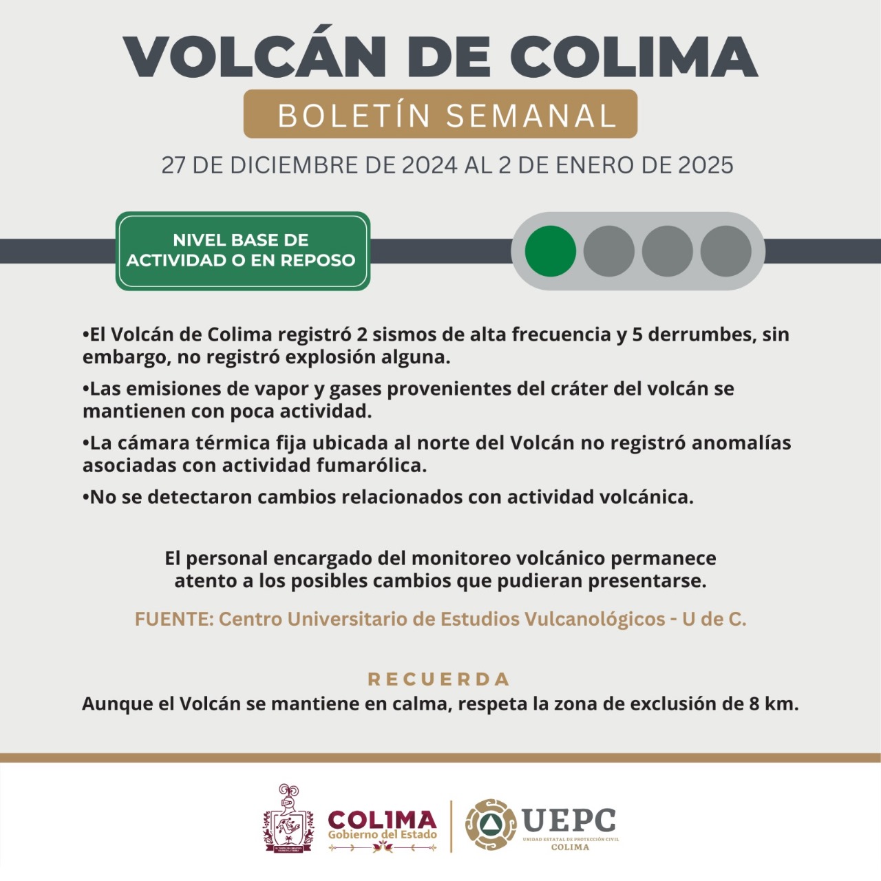 De acuerdo con el Centro Universitario de Estudios Vulcanológicos (CUEV) de la Universidad de Colima, del viernes 27 de diciembre de 2024 al jueves 2 de enero de 2025, contabilizó de forma manual dos sismos de alta frecuencia y cinco derrumbes, ninguno de ellos relacionado con actividad volcánica.