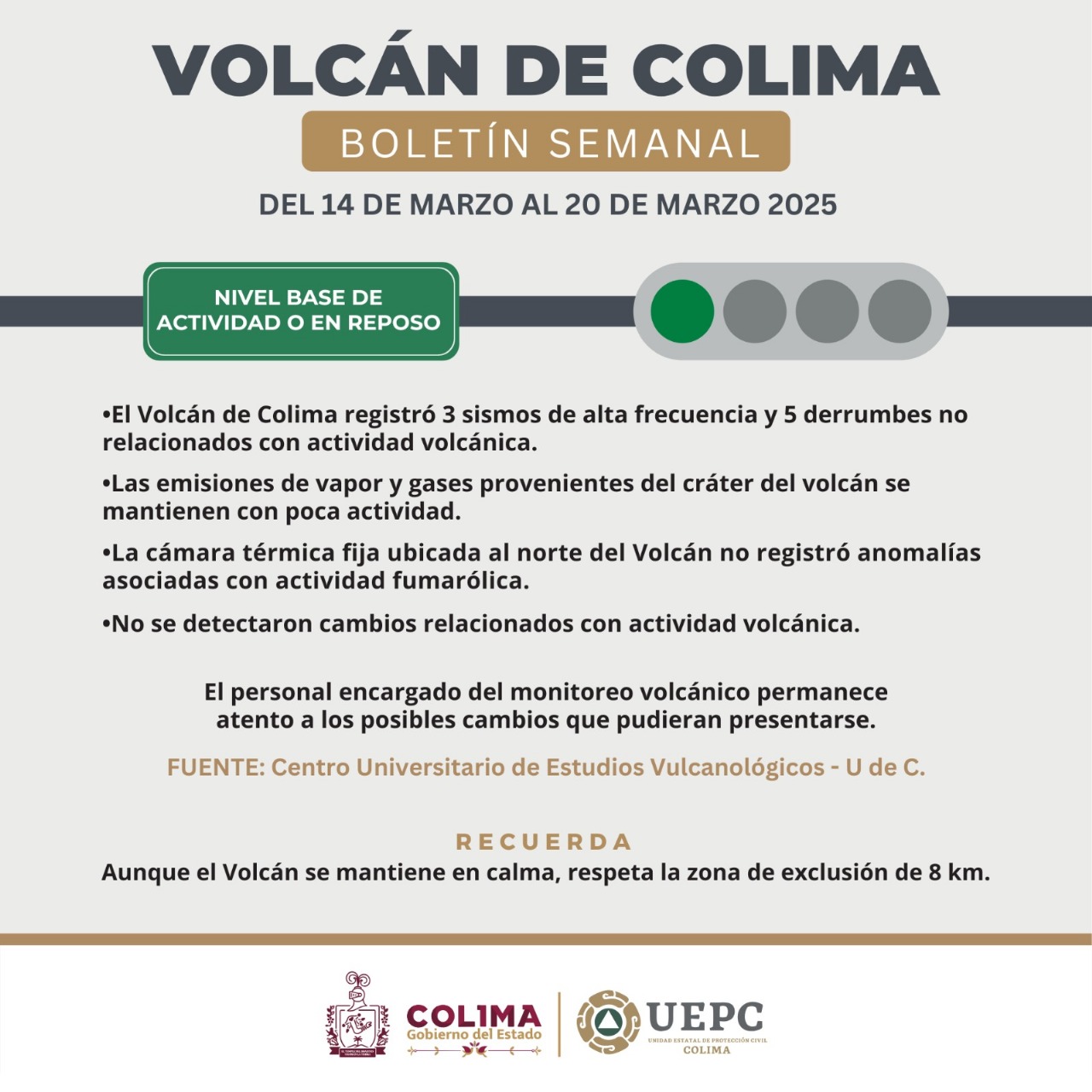 Aunque el Volcán de Fuego de Colima permanece en calma, la UECP reitera que por seguridad de la población colimense y turistas que visitan nuestra entidad, la zona de exclusión sigue siendo de 8 kilómetros en torno al edificio volcánico.