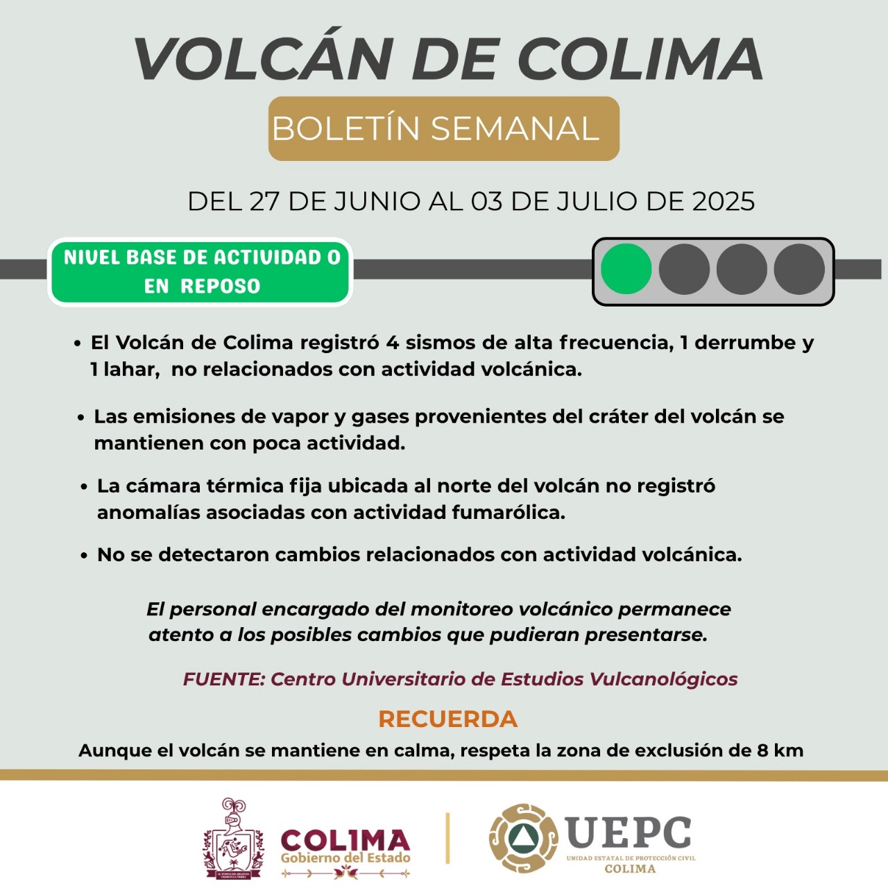 La Unidad Estatal de Protección Civil (UEPC) del Gobierno del Estado de Colima informa que, durante la semana del 27 de junio al 3 de julio, el Volcán de Fuego registró cuatro sismos de alta frecuencia, un derrumbe y un lahar, sin que esta actividad represente cambios en el comportamiento del Coloso, pues permanece en calma, con ‘semáforo verde’.